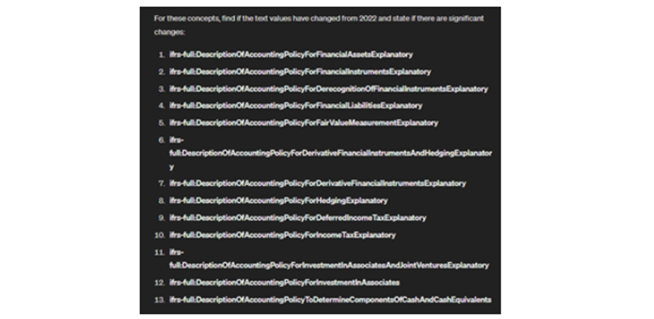 Aquí proporcioné a GPT-4 los datos necesarios cargando dos informes ESEF para la misma empresa en formato xBRL-JSON durante años consecutivos. En mi consulta, enumeré los conceptos de política contable relevantes y le pedí a GPT-4 que identificara cualquier cambio de texto entre los dos informes.