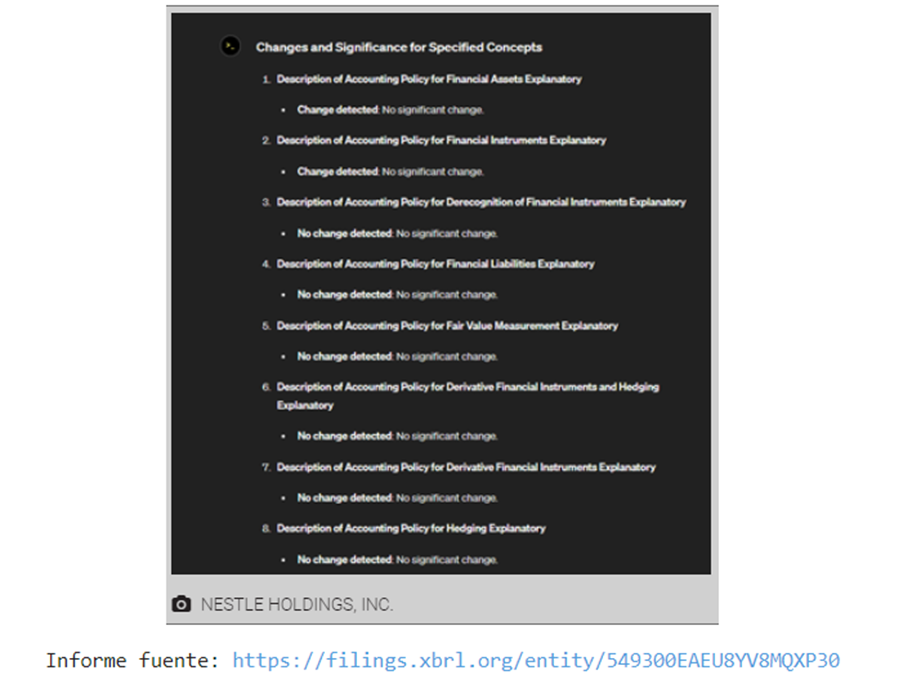 Para la primera empresa (Nestlé Holdings, Inc.), GPT-4 no reconoció ningún cambio significativo en el texto de la política contable.