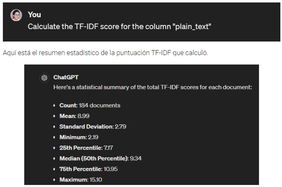 Aquí le proporcioné a GPT-4 divulgaciones de empresas en funcionamiento de 180 informes europeos en formato electrónico único (ESEF) y le pedí a GPT-4 que calculara las puntuaciones de TF-IDF. Normalmente, el proceso de calcular las puntuaciones TD-IDF implicaría el uso de Python, R o algún otro lenguaje estadístico y una variedad de habilidades de codificación especializadas.