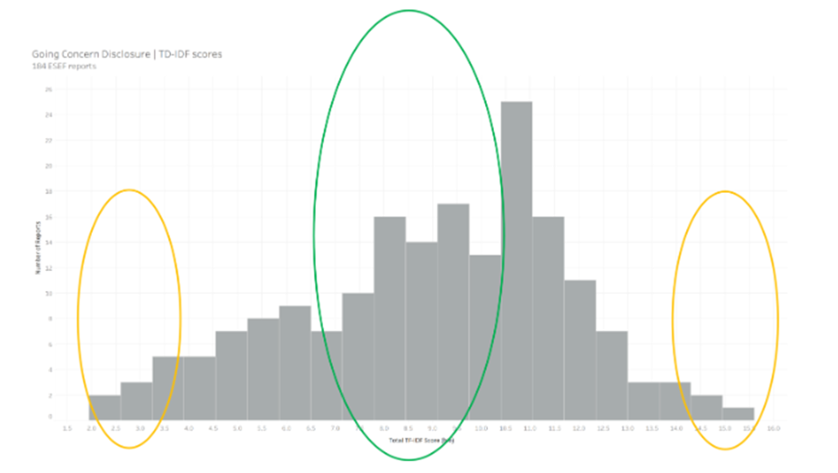 Entendamos e interpretemos estas partituras con ejemplos. A continuación, se presenta una divulgación de empresa en funcionamiento con una puntuación TF-IDF de 8,9, muy cercana a la media, que representa una divulgación típica dentro de la muestra. Parece una divulgación estándar de una empresa en funcionamiento sin nada particularmente sorprendente que destacar.