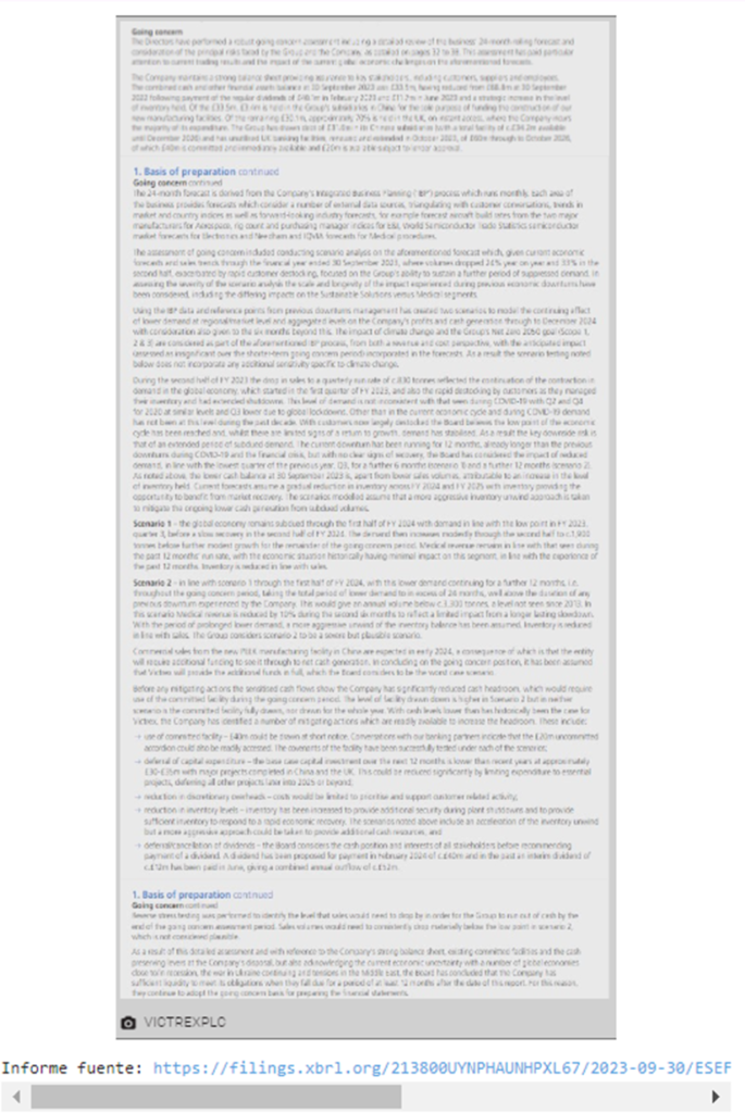 Esta divulgación es visiblemente más larga que una divulgación estándar de empresa en funcionamiento. Contiene frases notables como “el volumen cayó un 24%”, “menor demanda” y “no hay signos de recuperación”. Para cualquiera que realice un análisis temático sobre las revelaciones de empresas en funcionamiento, este informe se destaca como candidato para una mayor investigación. El estado financiero muestra una caída en los ingresos, las ganancias y el efectivo de las actividades operativas, lo que explica la extensión y el detalle de esta divulgación de empresa en funcionamiento e indica riesgos potenciales de interés para los analistas.