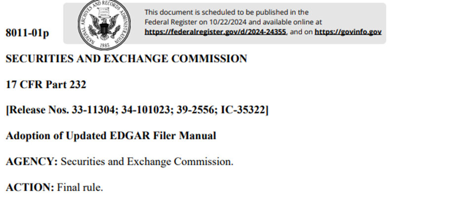 INFORMACIÓN COMPLEMENTARIA: Estamos adoptando un Manual del Declarante actualizado, Volumen II: «Presentación de EDGAR», Versión 71 (septiembre de 2024) y enmiendas a 17 CFR 232.301 («Regla 301»). El Manual del Declarante actualizado se incorpora por referencia al Código de Regulaciones Federales.
