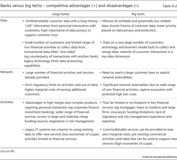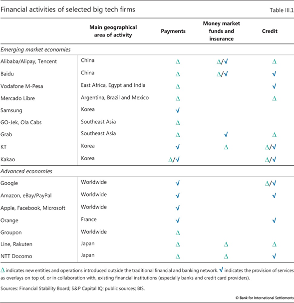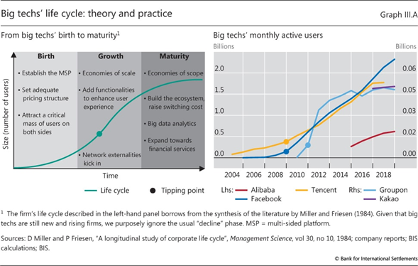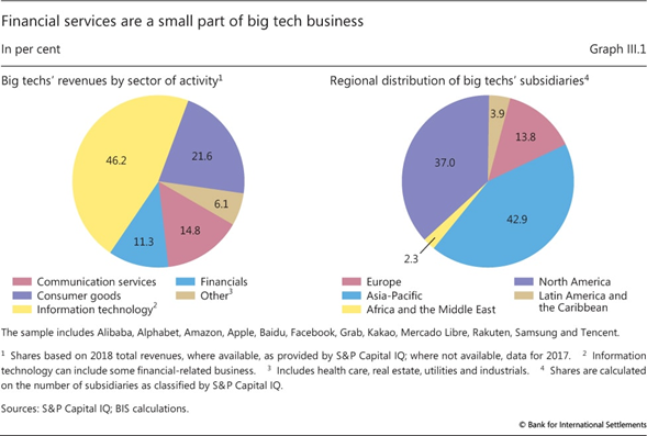 Aprovechando las ventajas de la naturaleza reforzadora del ciclo de actividades de red de datos, algunas grandes tecnologías se han aventurado en los servicios financieros, incluidos los pagos, la gestión del dinero, los seguros y los préstamos. Hasta ahora, los servicios financieros son solo una pequeña parte de su negocio a nivel mundial. Pero dado su tamaño y alcance de clientes, la entrada de las grandes tecnológicas en las finanzas tiene el potencial de provocar un cambio rápido en la industria. Ofrece muchos beneficios potenciales. El negocio de estructura de bajo costo de las grandes tecnologías se puede ampliar fácilmente para proporcionar servicios financieros básicos, especialmente en lugares donde una gran parte de la población permanece sin servicios bancarios. Mediante el uso de big data y el análisis de la estructura de la red en sus plataformas establecidas, las grandes tecnologías pueden evaluar el riesgo de los prestatarios, reduciendo la necesidad de garantías para asegurar el reembolso. Como tal,