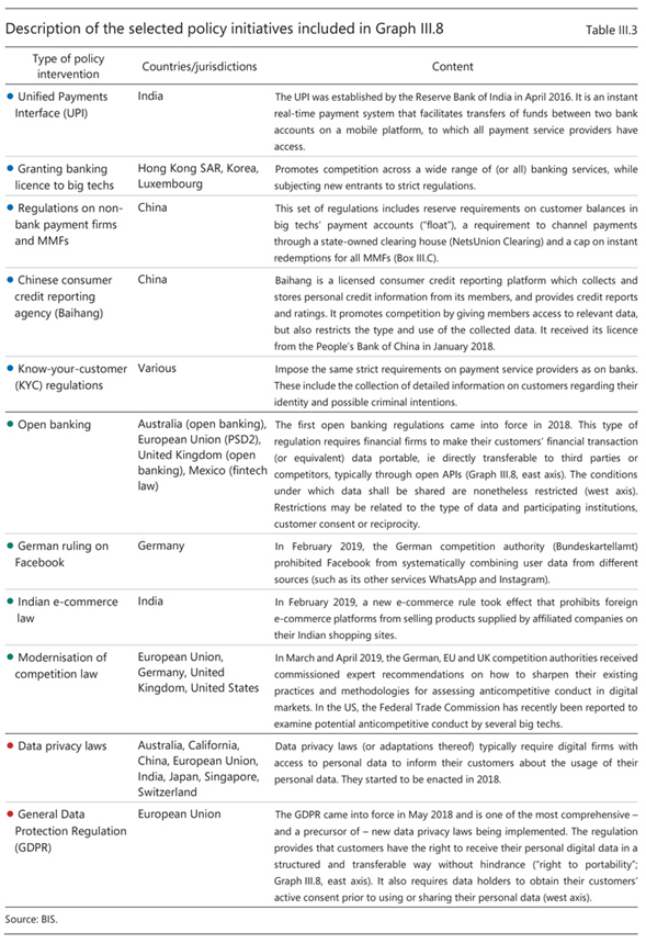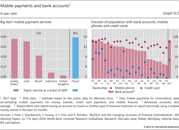 Los sistemas de superposición se utilizan con más frecuencia en los Estados Unidos y otras economías avanzadas, ya que las tarjetas de crédito ya eran omnipresentes cuando las empresas de comercio electrónico como Amazon y eBay se destacaron. Los sistemas de pago patentados prevalecen más en jurisdicciones donde la penetración de otros medios de pago sin efectivo, incluidas las tarjetas de crédito, es baja. Esto ayuda a explicar el gran volumen de servicios de pago de las grandes tecnologías en China: 16% del PIB, empequeñeciendo el de otras partes ( Gráfico III.2 , panel izquierdo).