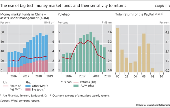 A pesar de su rápido crecimiento, los FMM afiliados a las grandes tecnologías en China todavía son relativamente pequeños en comparación con otros vehículos de ahorro. A fines de 2018, los saldos totales de FMM relacionados con las grandes tecnologías ascendían a CNY 2.4 billones (USD 360 mil millones), solo alrededor del 1% de los depósitos de los clientes bancarios o el 8% de los productos de gestión patrimonial pendientes.