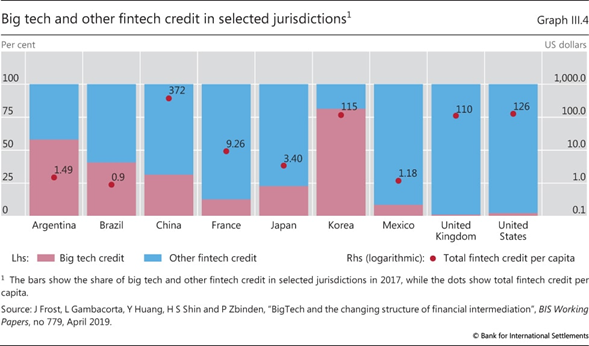 Sobre la base de sus plataformas de comercio electrónico, algunas grandes tecnologías se han aventurado a otorgar préstamos, principalmente a pymes y consumidores. Los préstamos ofrecidos suelen ser líneas de crédito o pequeños préstamos con vencimiento corto (hasta un año). El tamaño (relativo) de los grandes créditos tecnológicos varía mucho de un país a otro. Si bien el crédito per cápita total de fintech (incluidas las grandes tecnológicas) es relativamente alto en China, Corea, el Reino Unido y los Estados Unidos, las grandes tecnológicas representan la mayor parte del crédito fintech en Argentina y Corea ( Gráfico III.4 ).