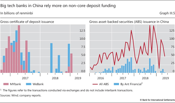 Una tercera opción es obtener fondos a través de la sindicación de préstamos o la titulización, que ya es una estrategia común entre las empresas de tecnología financiera. Por ejemplo, la emisión bruta de Ant Financial de valores respaldados por activos (ABS) negociados en bolsa representó casi un tercio de la titulización total en China en 2017 ( Gráfico III.5 , panel derecho).