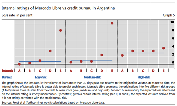 La evidencia preliminar sugiere que aprovechar los datos transaccionales con inteligencia artificial y aprendizaje automático podría ayudar a predecir las perspectivas de pago. Por ejemplo, el Gráfico 5 muestra que el modelo crediticio de Mercado Libre en Argentina ha superado, al menos en el corto plazo, al buró de crédito local en la predicción de pérdidas de los prestatarios corporativos.