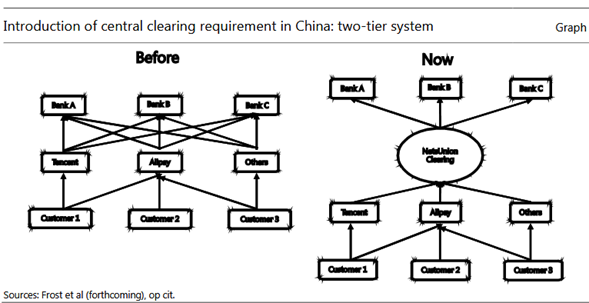En segundo lugar, desde junio de 2018, las grandes empresas de tecnología han tenido que canalizar los pagos a través de una cámara de compensación autorizada. Como puede verse en el panel derecho del Gráfico 7, el establecimiento de un sistema de compensación de dos niveles mejora la transparencia en el sistema de pagos chino. Esto le permite al PBC monitorear los fondos de los clientes en plataformas de pago de terceros.