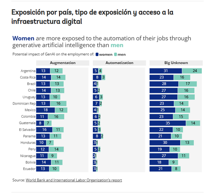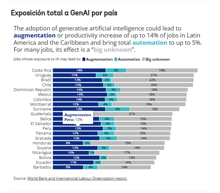 En general, entre el 26% y el 38% de los empleos en América Latina y el Caribe podrían estar expuestos a la IA generativa.