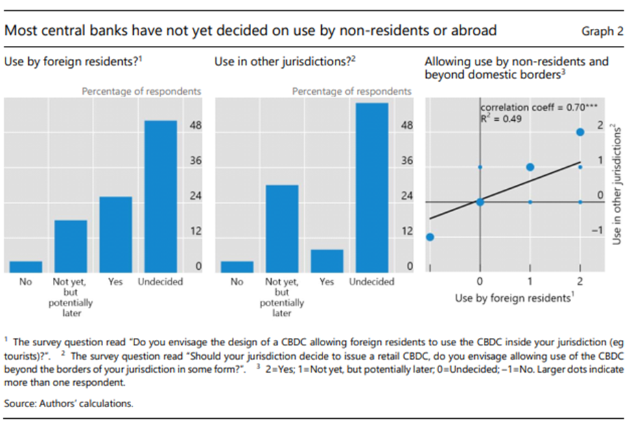 En particular, existe una fuerte correlación entre las opciones de permitir (potencialmente) el uso de CBDC por parte de no residentes y (potencialmente) permitir el uso más allá de las fronteras nacionales (Gráfico 2, panel derecho). Es más probable que los bancos centrales que consideren el uso por parte de turistas y visitantes en su propia jurisdicción vean al menos un posible papel para el uso extranjero de una CBDC nacional en el futuro.