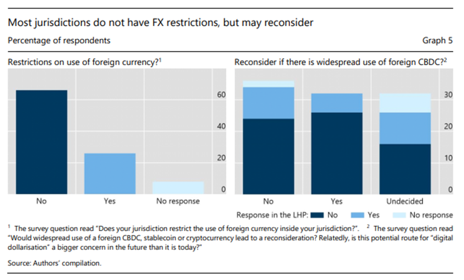 Las respuestas a la encuesta muestran que la mayoría de las jurisdicciones actualmente no tienen restricciones sobre el uso de moneda extranjera para transacciones en su jurisdicción nacional. Solo el 26% de los encuestados señaló tener tales restricciones, y un 8% adicional optó por no responder (Gráfico 5, panel de la izquierda). En particular, casi un tercio de los bancos centrales que respondieron pueden reconsiderar sus restricciones cambiarias si hubiera un uso generalizado de una CBDC extranjera en su jurisdicción; la mayoría de estos encuestados no tiene controles actualmente (Gráfico 5, panel de la derecha). Un tercio adicional no dio una respuesta afirmativa o negativa sobre si reconsiderarían.