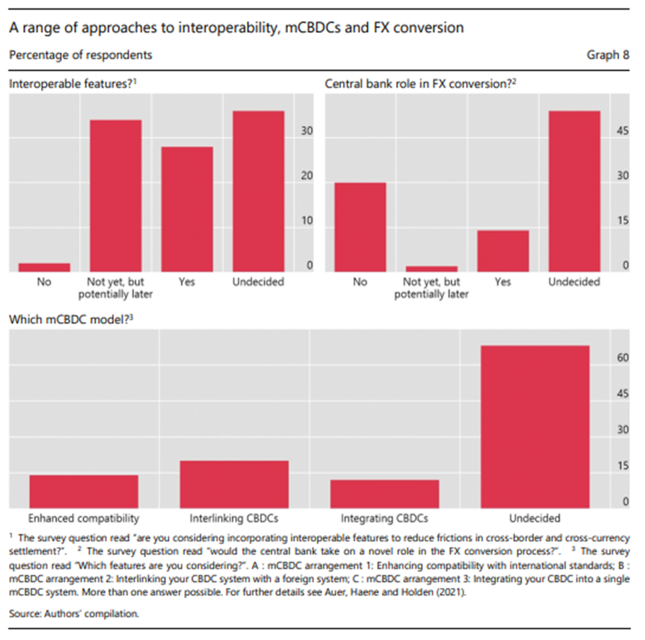 En el frente mayorista, los resultados de la encuesta muestran que los bancos centrales están considerando una variedad de acuerdos mCBDC. Algunos bancos centrales incluso están contemplando la posibilidad de que varias CBDC se ejecuten en un solo sistema. Mientras tanto, algunos bancos centrales están considerando nuevos roles operativos para el banco central en la conversión de divisas. En general, las respuestas muestran una consideración activa de los problemas transfronterizos y un gran interés en el aprendizaje entre pares a nivel internacional.
