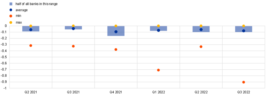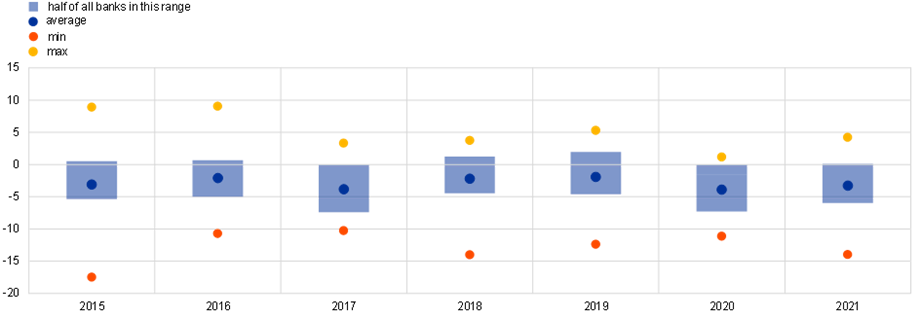 Notas: El gráfico muestra el rango de desviaciones estimadas de las puntuaciones oficiales de la G-SIB con respecto a las puntuaciones anuales estimadas basadas en los datos trimestrales de 23 grandes bancos de la Unión Bancaria Europea. Las casillas cubren el rango de desviaciones que representan el 50% medio de todos los bancos.