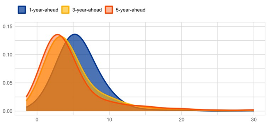 Nota: El gráfico muestra las densidades kernel de las expectativas de inflación de las empresas en varios horizontes.