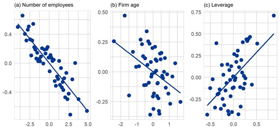 Notas: Los gráficos muestran diagramas de dispersión agrupados de varias características de las empresas y las expectativas de inflación de las empresas. Los datos mostrados se muestran en relación con el promedio dentro de los países, sectores y oleadas de encuestas.