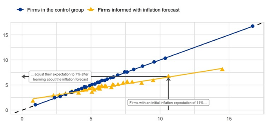 Las expectativas revisadas de las empresas del grupo de tratamiento se muestran mediante la línea amarilla, que es menos pronunciada que la línea azul (45°), que representa el grupo de control de empresas a las que no se les dio la posibilidad de ajustar sus expectativas. En general, las empresas tendieron a responder a la nueva información sobre la inflación ajustando sus expectativas. Esto sucedió a pesar de que la encuesta se realizó durante un período de alta inflación en junio de 2023, durante el cual es posible que las empresas ya estuvieran más al tanto de la información disponible públicamente, como la inflación actual, las previsiones y el objetivo de inflación del banco central.
