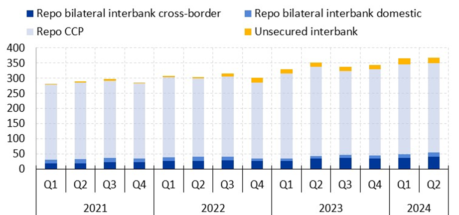 Los mercados de repos también se utilizan cada vez más para ayudar a cumplir con los requisitos de regulación de liquidez. El aumento de los volúmenes de repos se debió principalmente a las operaciones con vencimientos a 1 mes o más, que son más valiosas desde el punto de vista regulatorio en comparación con los vencimientos a corto plazo, y que se realizan cada vez más con bonos bancarios, especialmente bonos garantizados, transformando así los activos menos líquidos en el activo más líquido: el efectivo mantenido en el banco central.[4]