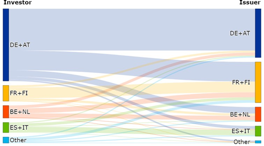 Cómo leer las cifras: De izquierda a derecha se puede seguir el flujo de las inversiones. Por ejemplo, los bancos alemanes y austriacos juntos parecen haber desempeñado un papel más importante como inversores que como emisores. Así, si bien invirtieron significativamente en su propio mercado nacional, también han desempeñado un papel relevante como inversor en otras jurisdicciones, redistribuyendo la liquidez.