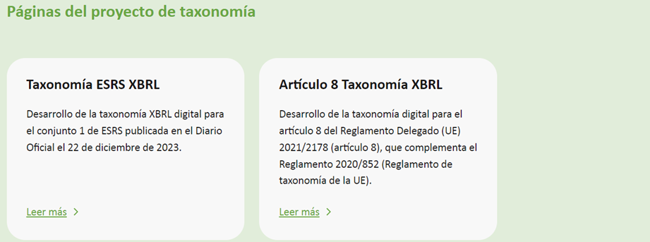 Se espera que la taxonomía XBRL final se entregue a la CE y a la ESMA durante el verano de 2024. Sobre la base de esta taxonomía XBRL, la Autoridad Europea de Valores y Mercados (ESMA) desarrollará el borrador de RTS para etiquetar la información de sostenibilidad, incluida la información del artículo 8. Dichas reglas de etiquetado serán finalmente adoptadas por la CE mediante un acto delegado (AD) que modifica el Reglamento Delegado (UE) 2019/815 de la Comisión sobre el Formato Electrónico Único Europeo (ESEF).