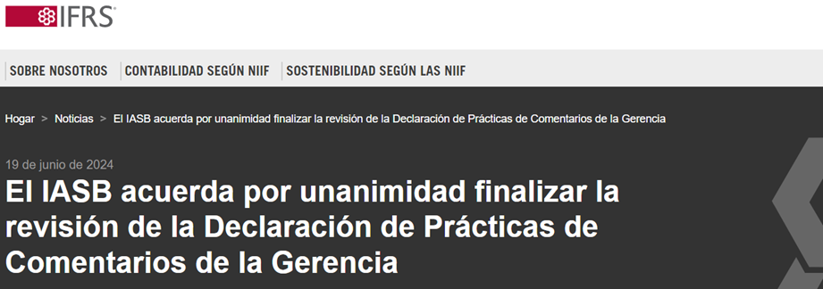 El 19 de junio, el Consejo de Normas Internacionales de Contabilidad (IASB) acordó por unanimidad finalizar la revisión del Comentario de la Gerencia de la Declaración de Práctica 1 de las NIIF. La decisión, basada en mejoras específicas al Borrador de Exposición sobre Comentarios de la Gerencia, tiene como objetivo mejorar la información sobre los factores que impactan la capacidad de una empresa para crear valor y generar flujos de efectivo.
