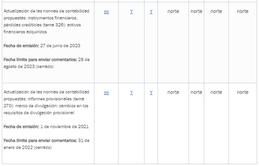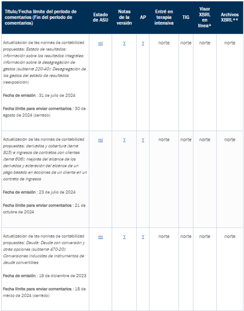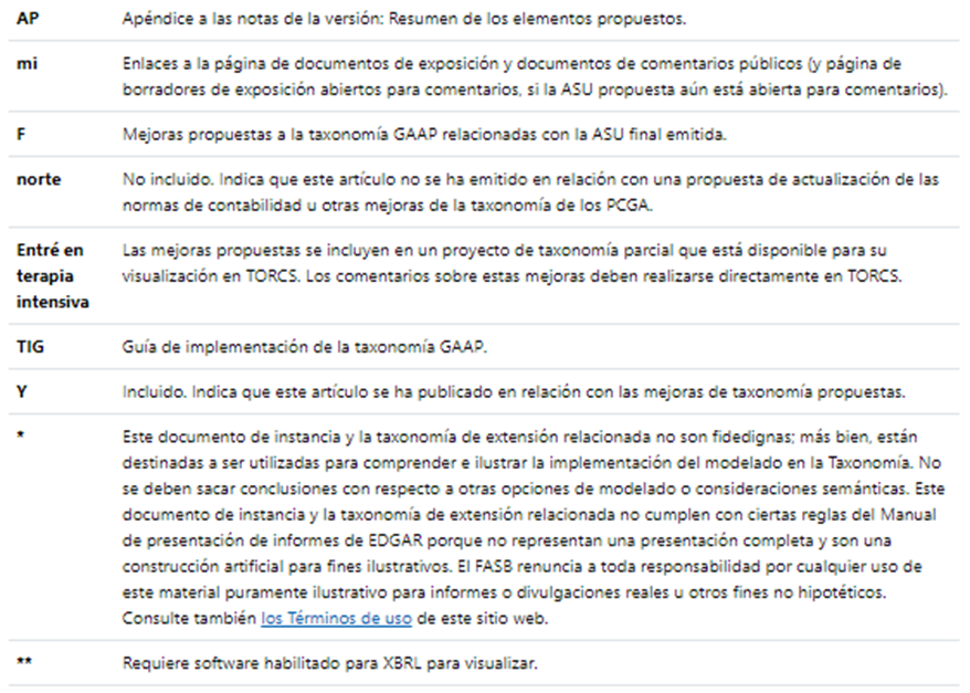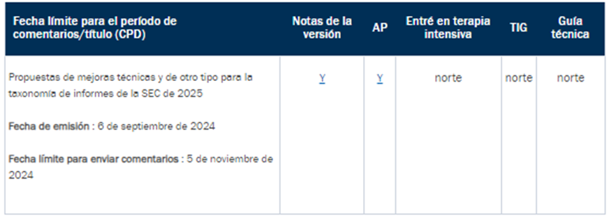 Las mejoras propuestas a la Taxonomía de informes financieros GAAP y a la Taxonomía de informes SEC (denominadas colectivamente como la “Taxonomía GAAP”) tienen períodos de comentarios formales que corresponden a las Actualizaciones de Normas Contables (ASU) propuestas relacionadas u otros proyectos de mejora de la Taxonomía GAAP propuestos.