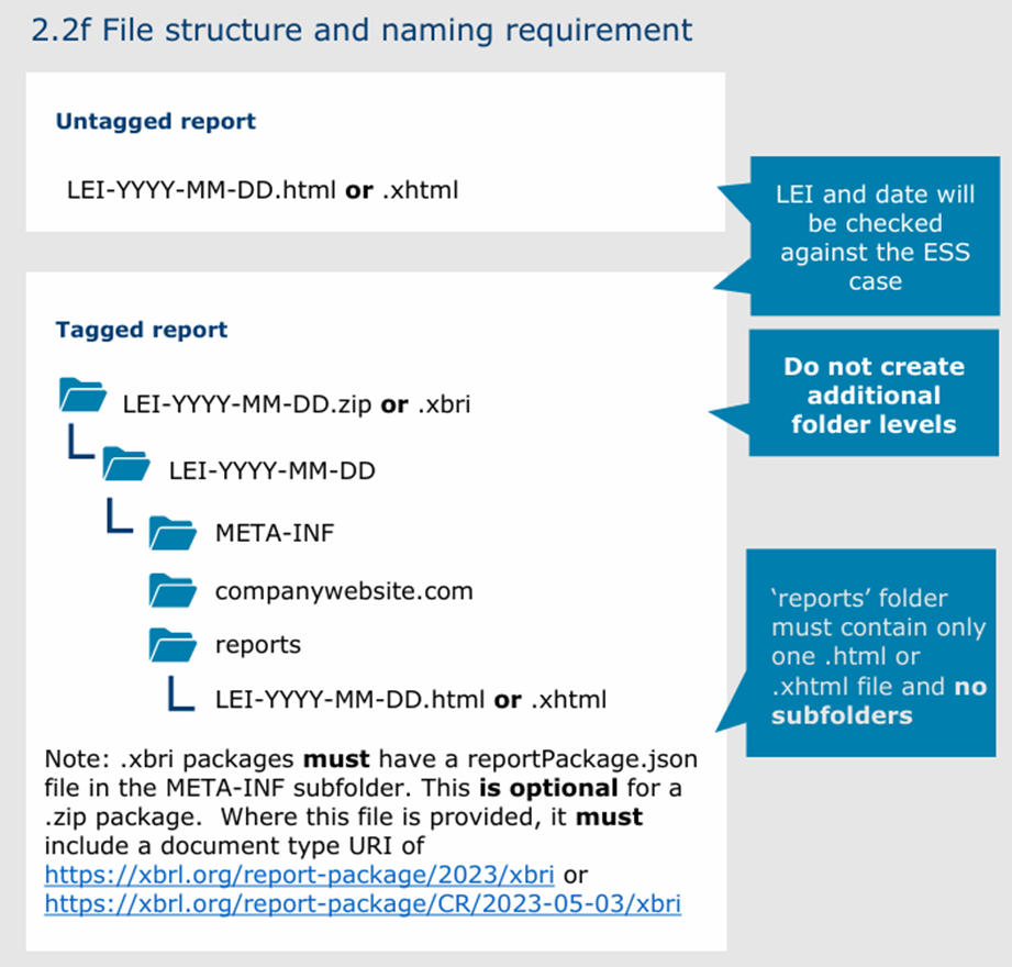 • El paquete de informes incluirá un informe que debe estar etiquetado con XHTML utilizando el formato iXBRL con una extensión de archivo ‘.html’ o ‘.xhtml’ únicamente.