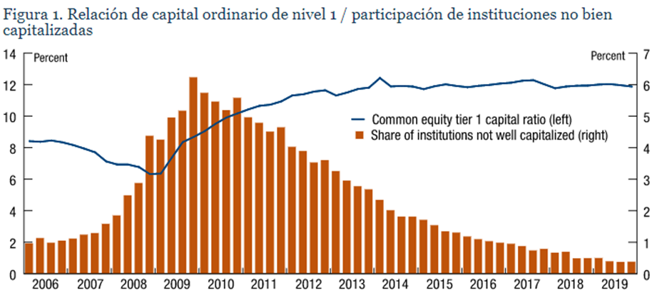 Las sólidas posiciones de capital permiten a las instituciones absorber mayores pérdidas crediticias mientras continúan prestando en momentos de tensión. El índice de capital agregado de capital ordinario de nivel 1 (CET1) de los bancos cerró 2019 en un nivel alto, cercano al 12 por ciento.[2] A fines de 2019, menos de la mitad del 1 por ciento de las instituciones no estaban bien capitalizadas ( figura 1 ).