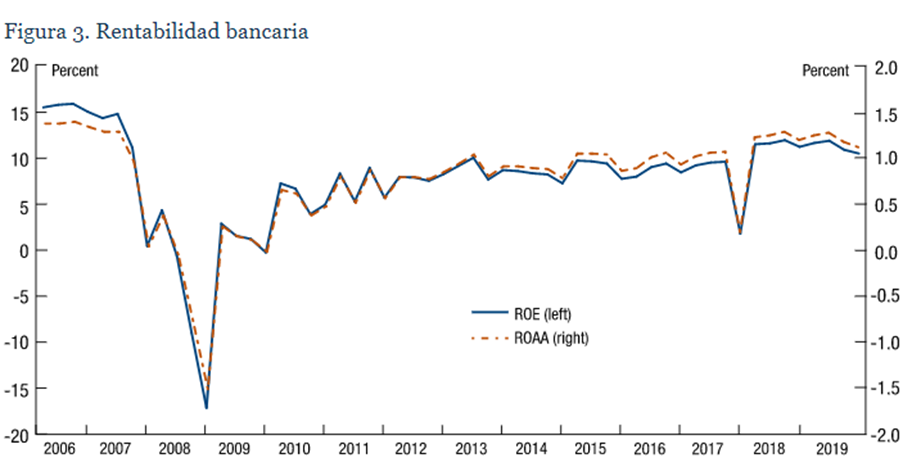 Las sólidas posiciones de liquidez (altos niveles de efectivo y valores fácilmente convertibles en efectivo) permiten a las instituciones financieras cumplir con sus obligaciones con los acreedores y otras contrapartes, mientras continúan apoyando a los hogares y las empresas. Las tenencias agregadas de activos líquidos de la industria bancaria se mantuvieron altas hasta fines de 2019 ( gráfico 2 ). Las instituciones financieras también habían generado ganancias constantes, posicionándolas bien para respaldar la continuidad de los préstamos. El rendimiento del capital (ROE) y el rendimiento de los activos promedio (ROAA) han experimentado una mejora significativa desde 2010. Las dos medidas terminaron 2019 muy por encima de sus promedios a largo plazo ( figura 3 ).
