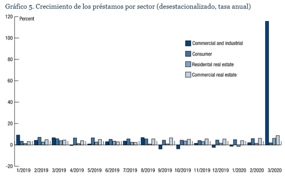 Los depósitos y préstamos bancarios crecieron a tasas extraordinarias en marzo ( gráfico 4 ). Los depósitos bancarios aumentaron cuando los inversores favorecieron los activos seguros y se retiraron de otras inversiones a corto plazo, como los fondos del mercado monetario de primera calidad. El fuerte crecimiento de los préstamos bancarios reflejó la preferencia de los prestatarios comerciales por buscar liquidez en respuesta a la actual contracción económica. Una parte importante del crecimiento de los préstamos bancarios se debió a la reducción de los compromisos crediticios existentes. Fuera del alto crecimiento de los préstamos comerciales e industriales, los préstamos a otros prestatarios crecieron en marzo, pero en mucha menor medida ( gráfico 5 ).