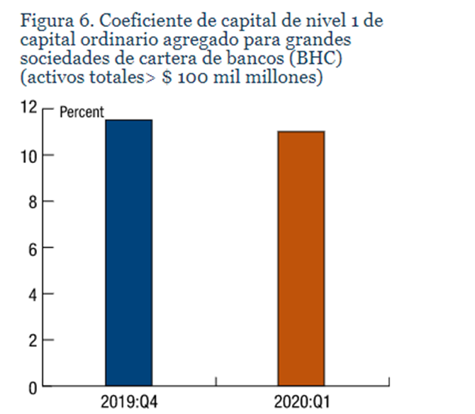 La mayoría de los grandes bancos estadounidenses informaron coeficientes de capital CET1 ligeramente más bajos para el primer trimestre de 2020, pero aún excedieron significativamente los requisitos regulatorios ( figura 6 ). En el caso de las 22 sociedades de cartera de bancos nacionales con activos superiores a 100.000 millones de dólares, esta relación en conjunto se redujo del 11,5 por ciento al final del cuarto trimestre de 2019 al 11,0 por ciento al final del primer trimestre de 2020. Fuerte crecimiento en ponderaciones por riesgo activos, el denominador del coeficiente de capital CET1, más que las reducciones en la cantidad real de capital, fue el principal impulsor de los coeficientes de capital más bajos. El aumento de los activos ponderados por riesgo se debió al aumento de los préstamos en el primer trimestre. Las grandes empresas han suspendido la recompra de acciones para preservar el capital.