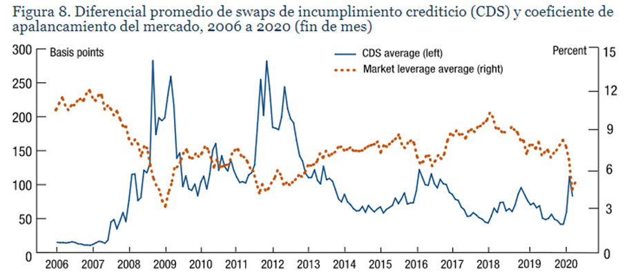 Los indicadores de mercado de la salud bancaria, como el índice de apalancamiento del mercado y los diferenciales de los swaps de incumplimiento crediticio (CDS), comenzaron a deteriorarse en la segunda mitad de febrero cuando los inversores comenzaron a valorar el impacto de la posible contracción económica. El índice de apalancamiento del mercado cayó desde mediados de febrero hasta la segunda mitad de marzo, antes de recuperarse algo.[1] Los diferenciales de los CDS también se deterioraron, subiendo desde mediados de febrero hasta la primera quincena de marzo, antes de volver a caer algo ( gráfico 7 ).[2] Sin embargo, ninguno de los indicadores alcanzó los extremos de la crisis financiera de 2008 ( gráfico 8 ). Esto puede reflejar la creencia de los inversores de que los bancos son más resistentes y están mejor posicionados hoy que durante la crisis financiera de 2008.