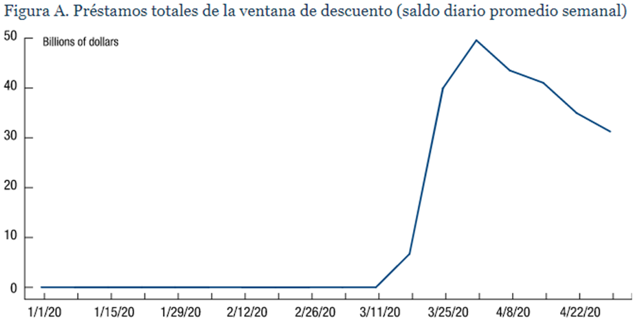 Con el fin de alentar a los DI a utilizar la ventana de descuento para satisfacer las demandas de crédito de los hogares y las empresas, la Reserva Federal anunció el 15 de marzo que reduciría la tasa de crédito primaria en 150 puntos básicos a 25 puntos básicos y permitiría a los DI tomar prestado del ventana de descuento por hasta 90 días. 1 La Reserva Federal, la Oficina del Contralor de la Moneda (OCC) y la Corporación Federal de Seguros de Depósitos (FDIC) apoyaron estas acciones al emitir una declaración interinstitucional alentando a los bancos a utilizar la ventana de descuento. Una declaración del 19 de marzo describió el notable aumento en los préstamos de la ventana de descuento que siguió y expresó su aliento de que los bancos estuvieran dispuestos a utilizar estos préstamos como fuente de financiación. 2El endeudamiento bancario de la ventana de descuento ha aumentado sustancialmente siguiendo los cambios detallados anteriormente ( figura A ). 3