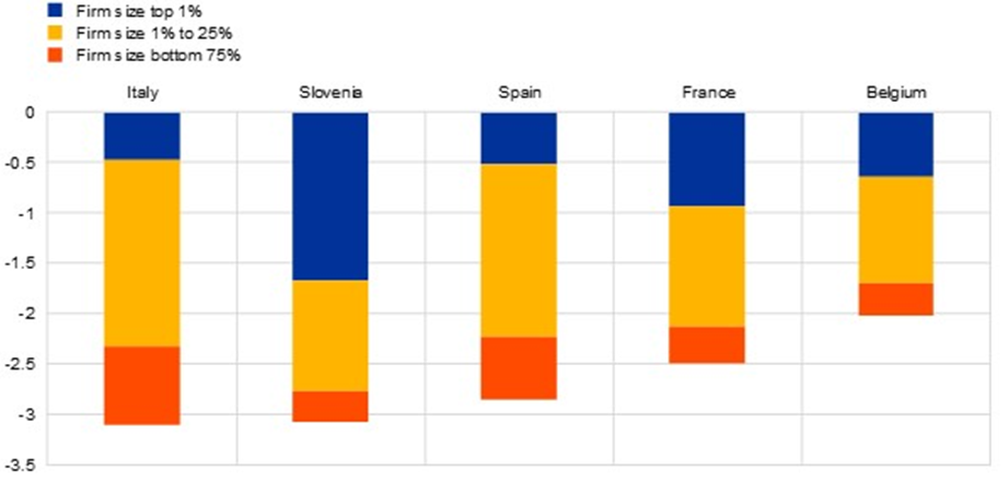 Utilizamos datos de comercio y balances a nivel de empresa de cinco países de la UE (Bélgica, Francia, Italia, Eslovenia y España) para arrojar luz cuantitativa sobre la exposición a los riesgos de suministro externo.[2]Utilizamos un modelo de equilibrio parcial a nivel de empresa, basado en un enfoque de función de producción, para evaluar el efecto de corto plazo de las interrupciones en el suministro de ICF de China y otros países con una orientación geopolítica similar (es decir, países alineados con China) sobre el valor agregado manufacturero. En el modelo, las empresas combinan mano de obra, capital e intermediarios, que a su vez se producen utilizando insumos con y sin componentes de capital fijo. Nuestro escenario base consiste en una caída repentina que reduce a la mitad la oferta de insumos con y sin componentes de capital fijo de los países alineados con China. En consonancia con la evidencia de las encuestas empresariales, suponemos que las empresas no pueden sustituir estos insumos en el corto plazo. Estas perturbaciones en el suministro de FCI generarían una caída del valor añadido manufacturero del 2,0% en Bélgica, del 2,5% en Francia, del 2,9% en España y del 3,1% en Italia y Eslovenia en el corto plazo (gráfico 2). Las grandes empresas son las que impulsan el cambio general, ya que representan alrededor del 75% de la caída del valor añadido en todos los países. Los resultados correspondientes al 1% superior de las empresas muestran una mayor heterogeneidad, ya que explican alrededor del 15% de la caída en Italia y España, alrededor del 30% en Francia y Bélgica, y más del 50% en Eslovenia.