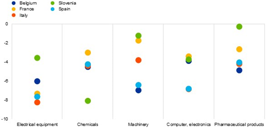 El impacto simulado es extremadamente heterogéneo entre los distintos sectores. La industria de equipos eléctricos se destaca como el sector más afectado, con una disminución media del valor agregado en los distintos países de alrededor del 7%, más del doble de la disminución media del valor agregado general, de menos del 3%. Otras industrias que experimentan disminuciones superiores a la media son las de productos químicos, metales básicos, electrónica y maquinaria (gráfico 3). En conjunto, estas cinco industrias representan casi un tercio del valor agregado manufacturero en nuestros países. Algunos sectores, como la electrónica, muestran una disminución similar en los distintos países, mientras que, en otros, como los productos químicos y la maquinaria, los resultados varían mucho más de un país a otro, lo que refleja diferentes composiciones de los subsectores y patrones de abastecimiento específicos de cada empresa.