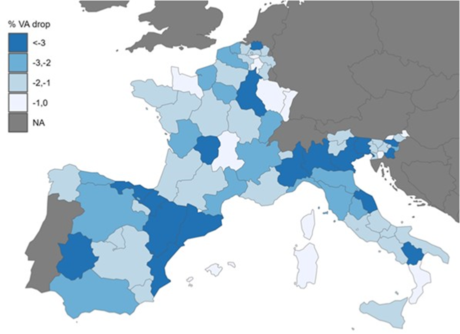 Los resultados regionales también son muy heterogéneos (gráfico 4). La gran heterogeneidad entre las regiones dentro de los países se debe a la especialización y la concentración. Las regiones más afectadas son las especializadas en sectores que dependen en gran medida de los ICF importados de países no pertenecientes a la UE. Por ejemplo, la región italiana de Las Marcas está relativamente más especializada que otras regiones en la producción de equipos eléctricos, que es una industria que depende en gran medida de la obtención de insumos críticos extranjeros de países alineados con China. La concentración de los principales productores en algunas regiones también contribuye a esta heterogeneidad: la presencia de empresas grandes y expuestas implica que su efecto sobre el valor agregado de su región es más sustancial, lo que es coherente con los efectos agregados que se muestran en el gráfico 2.
