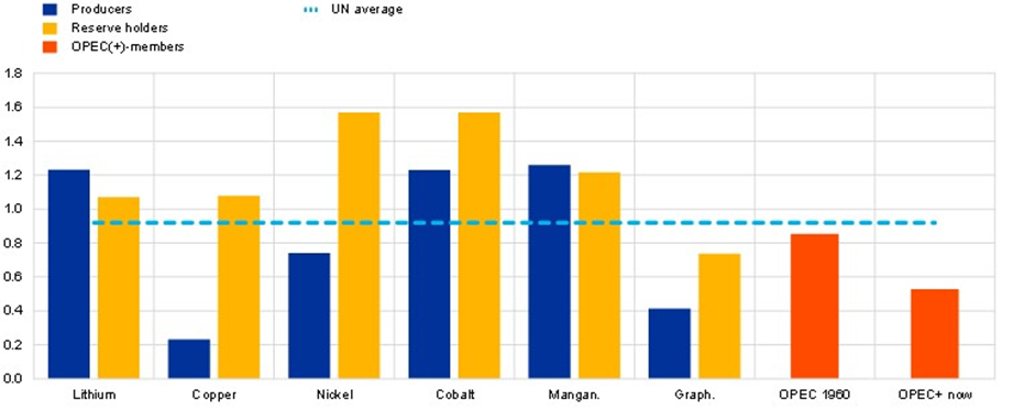 Notas: La puntuación de desacuerdo para cada mineral se calcula como el desacuerdo político promedio entre los tres principales productores o titulares de reservas. Para la OPEP (+), se utiliza el desacuerdo político promedio entre todos los países miembros.