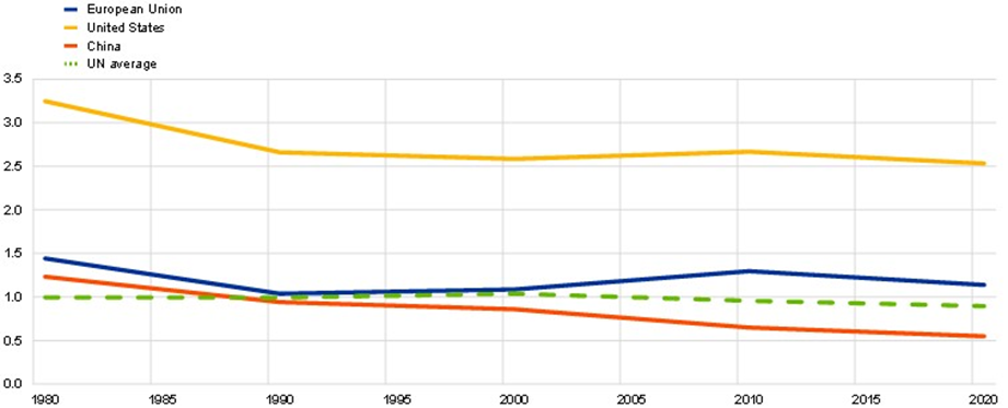 Geopolíticamente, China parece estar actualmente mejor posicionada que la UE y los Estados Unidos en términos de asegurar el suministro de minerales verdes. China exhibe el nivel más bajo de desacuerdo político con los principales productores mineros de minerales verdes (gráfico 4). Esta es una tendencia que comenzó al final de la Guerra Fría. Los niveles comparables de desacuerdo político de la UE están generalmente por encima de las medias de las Naciones Unidas, pero siguen estando muy por debajo de los niveles de los Estados Unidos.