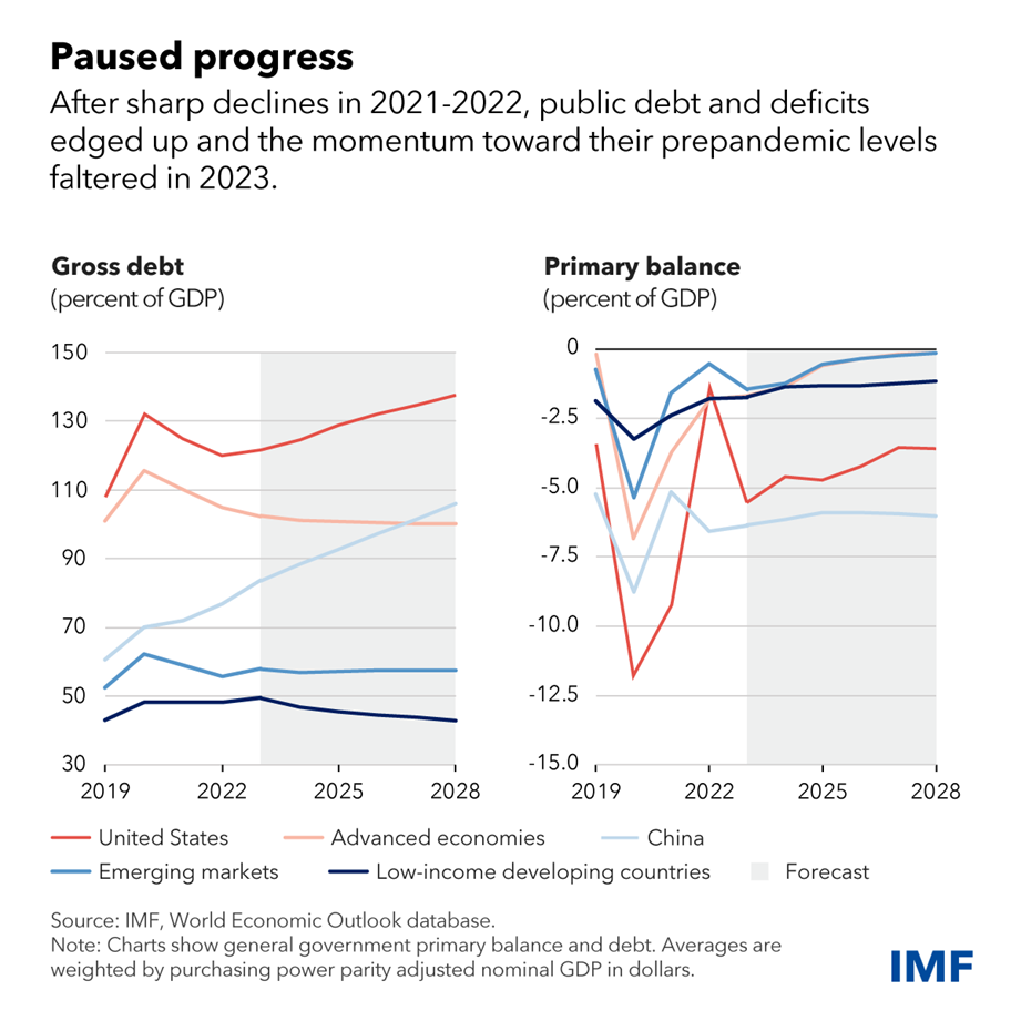 Las perspectivas económicas y financieras mundiales han mejorado en los últimos seis meses. La inflación ha caído, las condiciones financieras se han relajado y los riesgos para las perspectivas están equilibrados. Sin embargo, muchos países siguen luchando contra una elevada deuda pública y déficits fiscales en medio de nuevos desafíos derivados de las elevadas tasas de interés reales y las cada vez más débiles perspectivas de crecimiento a mediano plazo.
