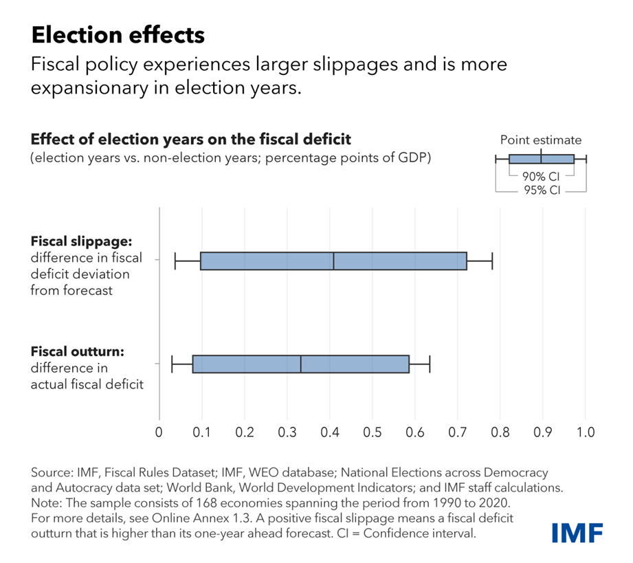 En 2024, un número récord de países, donde habita más de la mitad de la población mundial, celebrarán elecciones nacionales. La historia muestra que los gobiernos tienden a gastar más y gravar menos durante los años electorales. Los déficits en los años electorales tienden a superar las previsiones en 0,4 puntos porcentuales del PIB, en comparación con los años no electorales. En este gran año electoral, los gobiernos deberían ejercer moderación fiscal para preservar la solidez de las finanzas públicas.