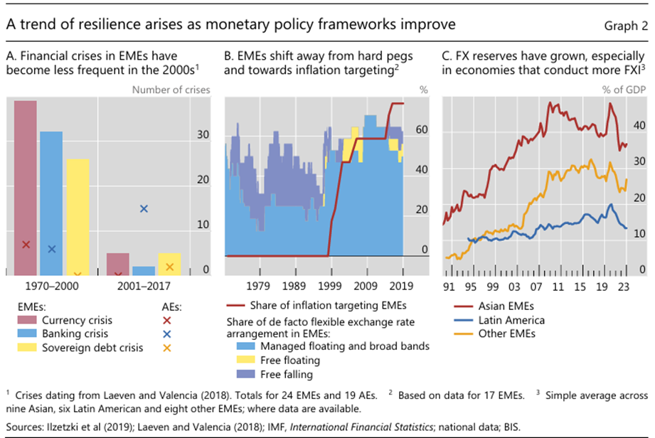 La frecuencia de las crisis financieras en las EME ha disminuido con el tiempo, así como en relación con la de sus homólogas de economías avanzadas (gráfico 2.A). Un conjunto de factores estructurales puede arrojar luz sobre la gran diferencia entre los episodios disruptivos de endurecimiento de las décadas de 1980 y 1990 y la experiencia desde la década de 2000.