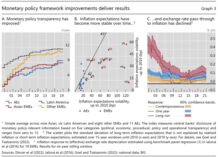 El primer factor estructural es la mejora de los marcos de política monetaria, lo que se refleja en el cambio hacia metas de inflación y una mayor flexibilidad del tipo de cambio (gráfico 2.B). Las flotaciones se han convertido en la norma, con diversos grados de intervención cambiaria (FXI), respaldada por reservas de divisas (FX) (gráfico 2.C). Al mismo tiempo, la política monetaria se ha vuelto más transparente, lo que aumenta la credibilidad entre los participantes en el mercado (gráfico 3.A). Como resultado, las expectativas de inflación se han estabilizado (gráfico 3.B) y el traspaso del tipo de cambio a la inflación ha disminuido (gráfico 3.C).