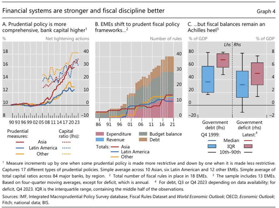 - Las economías de mercado emergentes rompieron con el pasado al mostrar resiliencia frente al rápido ajuste monetario en las economías avanzadas. En juego estuvieron factores estructurales, siendo clave una mejor política monetaria y marcos prudenciales.
