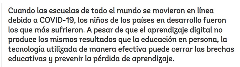 El acceso digital puede servir como un gran ecualizador. Los recursos deben invertirse sabiamente, teniendo en cuenta la infraestructura eléctrica de los países, la conectividad a Internet, los dispositivos habilitados digitalmente para los estudiantes más desfavorecidos y la capacidad de gestión e implementación de datos. Sin un proceso cuidadosamente considerado para aumentar el uso de la tecnología, las buenas intenciones y las políticas bien diseñadas no lograrán la recuperación y aceleración del aprendizaje que necesitan los países en desarrollo.